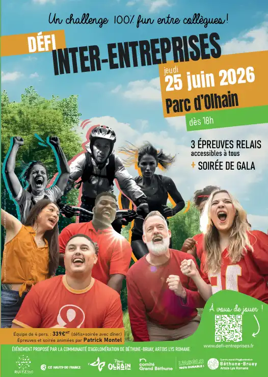 La Communauté d’agglomération de Béthune-Bruay, Artois Lys Romane a le plaisir de vous inviter à participer au défi inter-entreprises qui se déroulera le 25 juin 2026, à partir de 18h, au Parc d’Olhain.